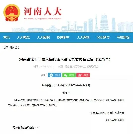 《河南省綠色建筑條例》已經(jīng)河南省第十三屆人民代表大會(huì)常務(wù)委員會(huì)第二十九次會(huì)議于2021年12月28日審議通過(guò),現(xiàn)予公布,自2022年3月1日起施行。