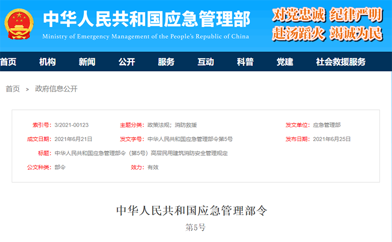 中華人民共和國(guó)應(yīng)急管理部令第5號(hào)《高層民用建筑消防安全管理規(guī)定》已經(jīng)2020年12月28日應(yīng)急管理部第39次部務(wù)會(huì)議審議通過,現(xiàn)予公布,自2021年8月1日起施行。部長(zhǎng) 黃明2021年6月21日高層民用建筑消防安全管理規(guī)定第一章 總則第一條為了加強(qiáng)高層民用建筑消防安全管理,預(yù)防火災(zāi)和減少火災(zāi)危害,根據(jù)《中華人民共和國(guó)消防法》等法律、行政法規(guī)和國(guó)務(wù)院有關(guān)規(guī)定,制定本規(guī)定。第二條本規(guī)定適用于已經(jīng)建成且依法投入使用的高層民用建筑(包括高層住宅建筑和高層公共建筑)的消防安全管理。第三條高層民用建筑消防安全管理貫徹預(yù)防為主、防消結(jié)合的方針,實(shí)行消防安全責(zé)任制。建筑高度超過100米的高層民用建筑應(yīng)當(dāng)實(shí)行更加嚴(yán)格的消防安全管理。第二章 消防安全職責(zé)第四條高層民用建筑的業(yè)主、使用人是高層民用建筑消防安全責(zé)任主體,對(duì)高層民用建筑的消防安全負(fù)責(zé)。高層民用建筑的業(yè)主、使用人是單位的,其法定代表人或者主要負(fù)責(zé)人是本單位的消防安全責(zé)任人。高層民用建筑的業(yè)主、使用人可以委托物業(yè)服務(wù)企業(yè)或者消防技術(shù)服務(wù)機(jī)構(gòu)等專業(yè)服務(wù)單位(以下統(tǒng)稱消防服務(wù)單位)提供消防安全服務(wù),并應(yīng)當(dāng)在服務(wù)合同中約定消防安全服務(wù)的具體內(nèi)容。第五條同一高層民用建筑有兩個(gè)及以上業(yè)主、使用人的,各業(yè)主、使用人對(duì)其專有部分的消防安全負(fù)責(zé),對(duì)共有部分的消防安全共同負(fù)責(zé)。同一高層民用建筑有兩個(gè)及以上業(yè)主、使用人的,應(yīng)當(dāng)共同委托物業(yè)服務(wù)企業(yè),或者明確一個(gè)業(yè)主、使用人作為統(tǒng)一管理人,對(duì)共有部分的消防安全實(shí)行統(tǒng)一管理,協(xié)調(diào)、指導(dǎo)業(yè)主、使用人共同做好整棟建筑的消防安全工作,并通過書面形式約定各方消防安全責(zé)任。第六條高層民用建筑以承包、租賃或者委托經(jīng)營(yíng)、管理等形式交由承包人、承租人、經(jīng)營(yíng)管理人使用的,當(dāng)事人在訂立承包、租賃、委托管理等合同時(shí),應(yīng)當(dāng)明確各方消防安全責(zé)任。委托方、出租方依照法律規(guī)定,可以對(duì)承包方、承租方、受托方的消防安全工作統(tǒng)一協(xié)調(diào)、管理。實(shí)行承包、租賃或者委托經(jīng)營(yíng)、管理時(shí),業(yè)主應(yīng)當(dāng)提供符合消防安全要求的建筑物,督促使用人加強(qiáng)消防安全管理。第七條高層公共建筑的業(yè)主單位、使用單位應(yīng)當(dāng)履行下列消防安全職責(zé):(一)遵守消防法律法規(guī),建立和落實(shí)消防安全管理制度;(二)明確消防安全管理機(jī)構(gòu)或者消防安全管理人員;(三)組織開展防火巡查、檢查,及時(shí)消除火災(zāi)隱患;(四)確保疏散通道、安全出口、消防車通道暢通;(五)對(duì)建筑消防設(shè)施、器材定期進(jìn)行檢驗(yàn)、維修,確保完好有效;(六)組織消防宣傳教育培訓(xùn),制定滅火和應(yīng)急疏散預(yù)案,定期組織消防演練;(七)按照規(guī)定建立專職消防隊(duì)、志愿消防隊(duì)(微型消防站)等消防組織;(八)法律、法規(guī)規(guī)定的其他消防安全職責(zé)。委托物業(yè)服務(wù)企業(yè),或者明確統(tǒng)一管理人實(shí)施消防安全管理的,物業(yè)服務(wù)企業(yè)或者統(tǒng)一管理人應(yīng)當(dāng)按照約定履行前款規(guī)定的消防安全職責(zé),業(yè)主單位、使用單位應(yīng)當(dāng)督促并配合物業(yè)服務(wù)企業(yè)或者統(tǒng)一管理人做好消防安全工作。第八條高層公共建筑的業(yè)主、使用人、物業(yè)服務(wù)企業(yè)或者統(tǒng)一管理人應(yīng)當(dāng)明確專人擔(dān)任消防安全管理人,負(fù)責(zé)整棟建筑的消防安全管理工作,并在建筑顯著位置公示其姓名、聯(lián)系方式和消防安全管理職責(zé)。高層公共建筑的消防安全管理人應(yīng)當(dāng)履行下列消防安全管理職責(zé):(一)擬訂年度消防工作計(jì)劃,組織實(shí)施日常消防安全管理工作;(二)組織開展防火檢查、巡查和火災(zāi)隱患整改工作;(三)組織實(shí)施對(duì)建筑共用消防設(shè)施設(shè)備的維護(hù)保養(yǎng);(四)管理專職消防隊(duì)、志愿消防隊(duì)(微型消防站)等消防組織;(五)組織開展消防安全的宣傳教育和培訓(xùn);(六)組織編制滅火和應(yīng)急疏散綜合預(yù)案并開展演練。高層公共建筑的消防安全管理人應(yīng)當(dāng)具備與其職責(zé)相適應(yīng)的消防安全知識(shí)和管理能力。對(duì)建筑高度超過100米的高層公共建筑,鼓勵(lì)有關(guān)單位聘用相應(yīng)級(jí)別的注冊(cè)消防工程師或者相關(guān)工程類中級(jí)及以上專業(yè)技術(shù)職務(wù)的人員擔(dān)任消防安全管理人。第九條高層住宅建筑的業(yè)主、使用人應(yīng)當(dāng)履行下列消防安全義務(wù):(一)遵守住宅小區(qū)防火安全公約和管理規(guī)約約定的消防安全事項(xiàng);(二)按照不動(dòng)產(chǎn)權(quán)屬證書載明的用途使用建筑;(三)配合消防服務(wù)單位做好消防安全