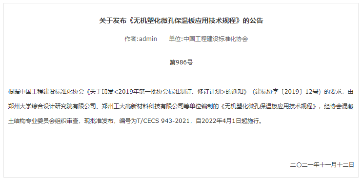 由鄭州大學綜合設計研究院有限公司、我司主編,中國建筑科學研究院有限公司等十七家單位參編的《無機塑化微孔保溫板應用技術規(guī)程》(以下簡稱:《規(guī)程》)近日發(fā)布,自2022年4月1日起施行。