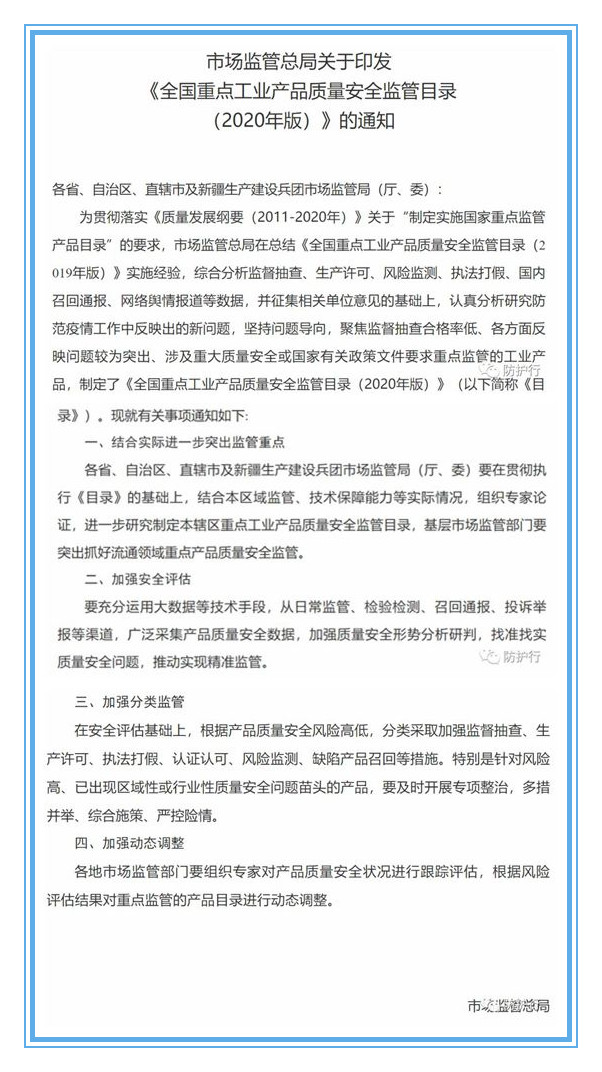 近日,市場監(jiān)管總局對《全國重點工業(yè)產(chǎn)品質(zhì)量安全監(jiān)管目錄(2019年版)》實施經(jīng)驗進(jìn)行總結(jié),綜合分析數(shù)據(jù),結(jié)合實際情況,征集相關(guān)單位意見,制定了《全國重點工業(yè)產(chǎn)品質(zhì)量安全監(jiān)管目錄(2020年版)》。
