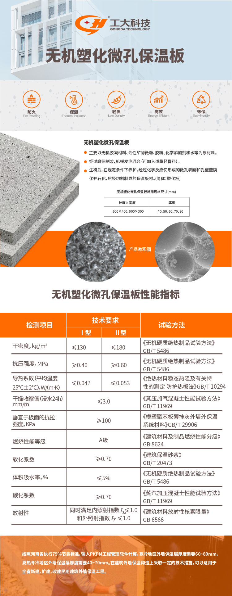 ? 無機(jī)塑化微孔保溫板是由鄭州工大高新材料科技有限公司經(jīng)過7年潛心研究,具有國內(nèi)領(lǐng)先地位和自主知識產(chǎn)權(quán)的最新產(chǎn)品。